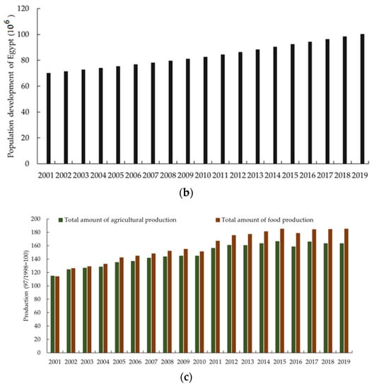 New Valley, as a significant agricultural society, has various industries that are of great importance to the local economy []. The cultivated area in New Valley increased from about 18,000 hectares in 1988 to approximately 29,000 hectares in 1998 [] due to land reclamation []; crop cultivation is the primary water-consuming sector in this area, consuming more than 75% of the water available in New Valley []. The increase in the size of the cultivated areas in New Valley, therefore, poses a threat to the limited natural resources available in this region, especially water [].