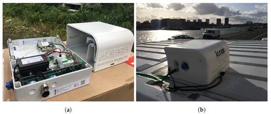 The Kunak AIR mobile sensor boxes were installed on 17 postal vans for opportunistic air quality monitoring in Antwerp (https://www.imeccityofthings.be/en/projecten/bel-air, accessed on 10 April 2022). A Kunak sensor box is equipped with three types of Alphasense sensors for measuring the concentration of particulate matter (PM1, PM2.5, PM10; OPC-N3), nitrogen dioxide (NO2; NO2-B43F) and ozone (O3; OX-B431), in-built sensors for measuring temperature and relative humidity of the environment, as well as a GPS for logging geographical coordinates (see Figure 2a) These sensors are continuously powered by a 12 V power supply from the vehicle battery and are equipped with LTE-M connectivity. The sensors also include a property algorithm to correct for the influence of environmental context and cross-interference between gases [45]. There is mobile housing provided by LABAQUA surrounding each Kunak sensor box to reduce the impact of turbulent airflow on sensors while the vehicle is in motion (see Figure 2b).