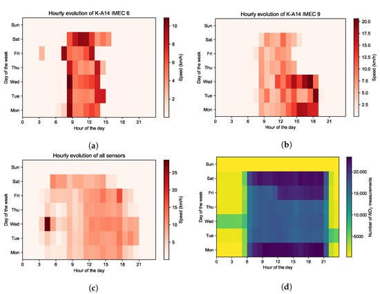 (a) The hourly evolution of the speed of mobile sensor K-A14 IMEC 6, (b) mobile sensor K-A14 IMEC 8 and (c) all mobile sensors during each day of the week on May 2021. (d) The hourly evolution of the number of NO2 measurements collected by all mobile sensors during each day of the week on May 2021.