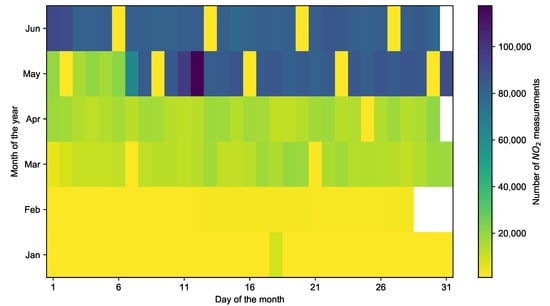 The number of NO2 measurements collected by all mobile sensors per day from January to June 2021.