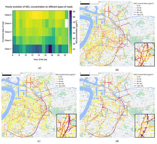 (a) The hourly evolution of NO2 concentration on different types of roads. The map of average NO2 concentration at 100 m road segments during (b) morning rush hours (6:00∼10:00), (c) midday hours (11:00∼15:00) and (d) evening rush hours (16:00∼20:00), respectively.