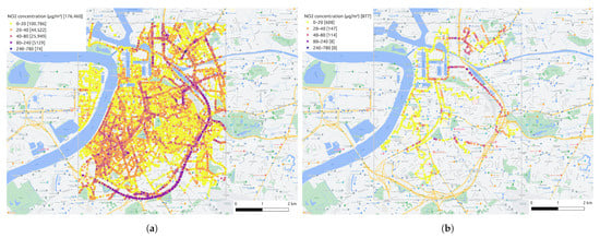 (a) The map of all aggregated NO2 measurements after data processing procedures. (b) The map of aggregated NO2 measurements at 11:00 on 9 June 2021. The color bar represents various NO2 concentration level and the number followed means the amount of measurements at that level.