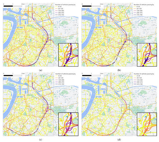 Figure 8. Traffic volume (i.e., the number of vehicles passing per 5 min) on road segments in study area at (a) 9:00, (b) 13:00, (c) 17:00 and (d) 21:00 on 10 June 2021. A small region is enlarged for better visualization in the bottom right corner.