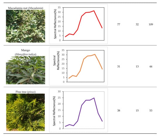 The retained data were partitioned into 70% (387) train data and a 30% (176) validation set using SDM Random Select Points function to prevent biasness in the classification model [69]. Furthermore, purposeful sampling was employed to digitize additional samples for the underrepresented classes (i.e., bare soil, build-up, guava). The summary statistics of the most common fruit-tree crops and other land-use types identified in the field with their average reflectance, field photos, and the reference data are presented in Figure 3.