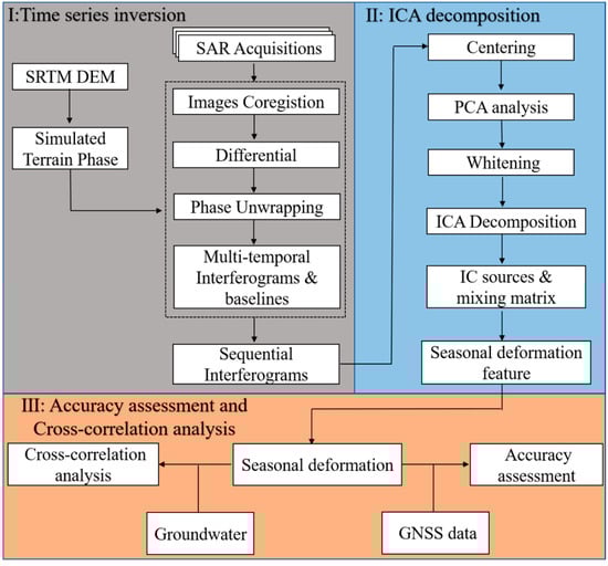 Extracting and isolating the spatiotemporal deformation information driven by different geophysical processes from the observed InSAR time series is an important and difficult task in current InSAR time series analysis. In order to increase the understanding of geophysical processes, people need to extract useful information from massive InSAR observations. However, the deformation time series provided by InSAR are affected by many factors, including various error sources and geophysical signals that are difficult to quantify. Principal component analysis (PCA) and independent component analysis (ICA), as blind source separation (BSS) technologies, have been introduced into the field of InSAR to separate geophysical signals of interest. PCA uses the second-order statistical information of the mixed signal to extract uncorrelated principal components (PCs), which have been applied to filter InSAR time series [27], invert geodetic time series [28], and identify ground motion with various characteristics [29,30]. The ICA algorithm, which is an extension of PCA, uses high-order statistical information to measure the independence of the source signals. The independent components (ICs) are not correlated and are independent of each other. Specifically, ICA has also been applied to InSAR data processing, including atmospheric delay extraction [31], DEM error estimation [32], and spatiotemporal analysis of InSAR time series [9,33,34,35].