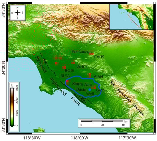 The basin is mainly composed of three main aquifer systems, known as the Shallow, Principal, and Deep, which are hydraulically connected, and the Newport–Inglewood fault forms the southwest boundary of all aquifers except shallow aquifer. The total thickness of sedimentary rocks in the basin exceeds 20,000 feet, with fresh water only in the upper 2000 to 4000 feet, and the thickness of freshwater sediments is less than 1000 feet at the edge of the basin [49]. Since the Oligocene period, structural folding and faulting have occurred along the basin margins, as well as down warping and deposition within the basin. From a hydrogeological point of view, the Newport–Inglewood fault zone is the most important tectonic feature of the basin, and the fold and fault along it create natural limitations on the intrusion of seawater into the groundwater basin [50]. In the coastal and central part of the basin, a series of complex interconnected sand and gravel deposits are widely separated by clay and silt deposits or aquitards with lower permeability, and the clay and silt deposits become thinner and more discontinuous, which make it easier for large amounts of groundwater to flow between shallow and deeper aquifers.