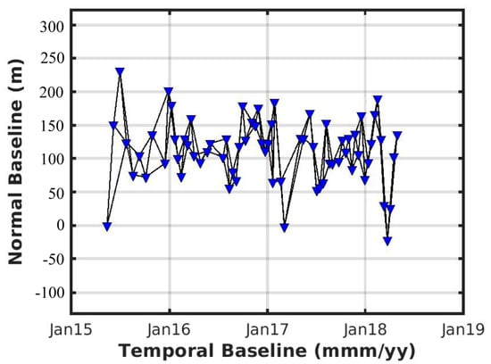 For the descending Sentinel-1A data, the maximum perpendicular baseline is 250 m, and the temporal baseline changes from 6 days to 96 days. We create a short-baseline interferometric network, where 135 interferograms are initially generated (Figure 3). The resolution of each ground pixel in the interferogram is about 50 m × 50 m, generated by performing multi-looking with a factor of 20 looks in the range and 4 looks in the azimuth, respectively. An improved Goldstein filter method is then applied to remove the noise in the interferograms, and we use the minimum cost flow algorithm to unwrap each interferogram. In order to reduce the unwrapping error, we only choose interferograms with coherence greater than the average threshold of 0.6, and the GNSS site ELSC is selected as the reference point of unwrapping. We convert the interferometric phase with short baselines into sequential interferometric phase by the LS method, and the phase is multiplied by the constant −λ/4π to obtain the deformation time series. Before ICA separation, temporal high-pass filtering is used to remove part of the high-frequency turbulent atmosphere.