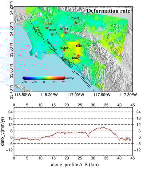 (Top) Mean LOS rate map over the Santa Ana basin from 2015 to 2018. A–B is the selected section line transecting obvious surface deformation. Red Pentagrams show the locations of the SCIGN GNSS sites for accuracy validation. (Bottom) Deformation rate of the observation points along the profile A–B.
