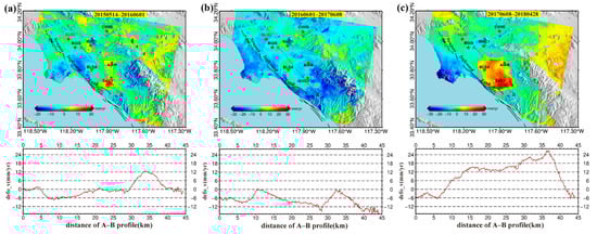 Mean LOS velocity maps over the Santa Ana basin for different years: (a) 20150514–20160601, (b) 20160601–20170608, and (c) 20170608–20180428. A–B is the selected section line transecting obvious surface deformation. Red Pentagrams show the locations of the SCIGN GNSS sites for accuracy validation.