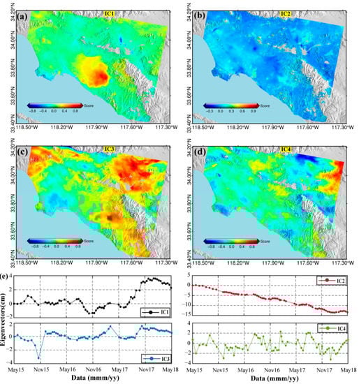 We apply the FastICA algorithm to the InSAR time series [41], and Figure 7 shows the temporal and spatial characteristics of the independent components (ICs) obtained from the InSAR time series. In order to visually compare each component, the spatial component is usually standardized, that is, the spatial value range is scaled to [–1,1]. Figure 7a–d show the score value of the spatial pattern of the four independent components, respectively, and the score value represents the spatial contribution of the corresponding component of the point. Figure 7e shows the temporal eigenvectors of each independent component. For the first independent component of ICA (IC1), the temporal eigenvector shows obvious seasonality, and the subsidence trend in the summer is opposite to that in winter. The score value map is mainly concentrated in the Santa Ana basin, with a positive value, and the shape is similar to a subsidence area. According to the temporal and spatial characteristics of the IC1, we can conclude that the Santa Ana basin has a seasonal deformation with a period of about one year. IC2 describes a linear deformation process with an obvious high time correlation. The score map basically covers the whole study area, but the score value is about zero in the basin, indicating that there is a small linear motion there. We speculate that IC2 may be related to tectonic movements along nearby faults. The IC3 and IC4 score maps describe randomly distributed signals (Figure 7c,d, respectively), and the temporal eigenvectors of IC3 and IC4 are random and swing up and down at zero. We assume that these two components are related to error signals. It can be seen from the above analysis that IC1 is the component we are most interested in and can adequately describe the spatiotemporal characteristics of the Santa Ana basin.