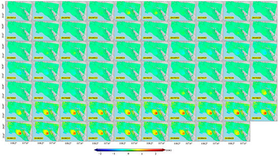 However, it is not common for all interferograms to belong to a single subset, resulting in the matrix being a singular matrix, which will produce infinite sets of solutions. In this case, singular value decomposition (SVD) [38] and iterative reweighted least squares (IWLS) [39] can be used to obtain the pseudo inverse of matrix , so as to obtain the minimum normal solution of the equations. However, large discontinuities may be introduced into the obtained phases of the time series, resulting in physically meaningless results, especially when atmospheric delay exists in the interferometric phase [40]. In order to improve the time sampling rate of the phase and obtain a meaningful sequential phase, the above function model can be established in each subset and solved by LS [32].