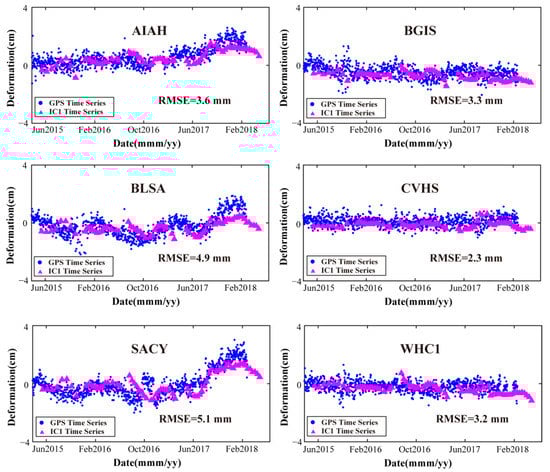 Comparison between the GNSS- and ICA-derived LOS displacements at GNSS stations AIAH, BGIS, BLSA, CVHS, SACY and WHC1. Blue dots and magenta triangles represent GNSS- and IC1-derived deformations, respectively. The RMSEs between them are marked in the sub-plots.