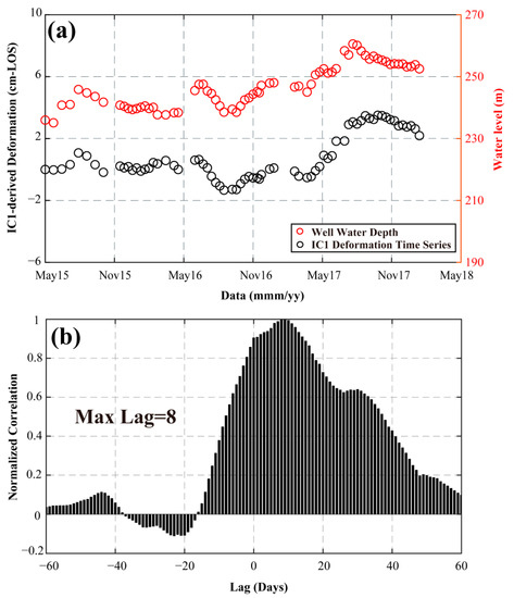 We further explain the relationship between water level and IC1-derived deformation time series through a cross-correlation analysis, which can quantify the seasonal effects on surface deformation. The cross-correlation coefficient is a standard parameter for estimating the degree of correlation between two series and provides a good explanation for the correlation between IC1-derived deformation time series and groundwater level with different time scales in the basin. Figure 10b shows the cross-correlation coefficient, and the maximum delay represents the number of days of delay when the cross-correlation coefficient reaches a maximum. The IC1-derived deformation time series and groundwater level are positively correlated with a lag of only 8 days, indicating that the surface deformation responds quickly to the changes in water level. Therefore, by using the cross-correlation coefficient, we can determine that the seasonal deformation of the basin is mainly caused by the groundwater factor.