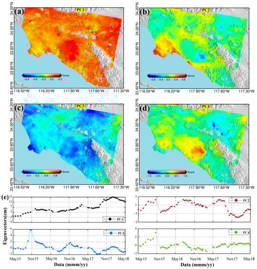 PCA results for the descending InSAR time series. Four independent components are isolated. (a–d) show the score values of the spatial patterns of the principal components, respectively, and (e) shows the temporal eigenvectors of each principal component.