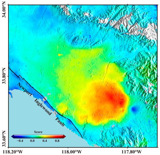 The Newport–Inglewood fault (NIF) has been identified as an active fault zone, which is located on the western edge of the Santa Ana basin and can produce damaging earthquakes [14]. The score value ranges from −0.6 to −0.2 along the west side of the NIF, while the score ranges from 0.2 to 1 along the east side, as shown in Figure 12. The comparison of IC1 score values on both sides of NIF is very obvious, and the fault is the active boundary of seasonal displacement. Outside the basin, the score decreases rapidly, especially at the western margin of the basin bounded by the NIF. The fault can prevent the movement of groundwater, resulting in long-term uplift. It should be noted that the seasonal deformation in the Santa Ana basin is more complex due to the contribution of anthropogenic and tectonic signals. By using the multitemporal InSAR method and ICA, it is determined that most of the deformation near NIF is related to groundwater pumping rather than tectonic fault movements.