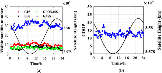 Only antenna 1 located in +Z direction of the satellite’s body system can receive GNSS signals when the satellite is in GEO mission orbit, and at least 24 GNSS satellites can be observed in the full arc, among which there are about 8–12 GPS, and Geometric Dilution of Precision (GDOP) is around 13, as shown in Figure 4.