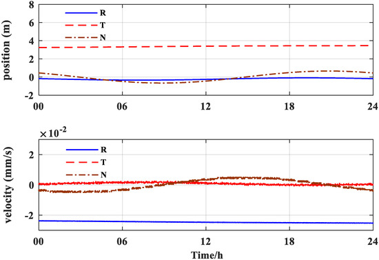 Since the real-time POD uses the broadcast ephemeris, which has a position error of several meters, the orbit is determined based on the GPS broadcast ephemeris. Figure 5 shows that the accuracy of the position and velocity is 3.96 m and 0.03 mm/s, respectively, in the RTN coordinate system, which is similar to the results of Wu and Fan [59,60]. They analyzed the orbit determination accuracy of the XY-2 satellite and the SJ-17 satellite using onboard GNSS data.