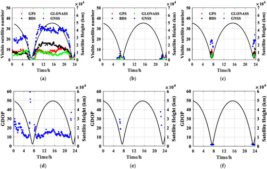 As shown in Figure 6, satellite height varied from 2030 km to 49,422 km, with an orbit period of about 16 h. In arcs above 8000 km, antennas 1 and 2 can receive GNSS signals opposite the earth, the visible GNSS number of antenna 1 is stable at 16~34, and the GDOP of antenna 1 is around 20. In the arc below 8000 km, only antenna 3 can receive the overhead GNSS signal, the visible GNSS number of antenna 3 is stable at 12–18, and the GDOP of antenna 3 is around 1.5.