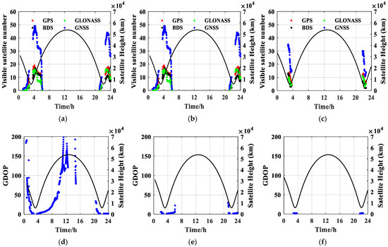 Visible GNSS number and GDOPs of antennas 1, 2, and 3. (a) Visible GNSS number of antenna 1. (b) Visible GNSS number of antenna 2. (c) Visible GNSS number of antenna 3. (d) GDOP of antenna 1. (e) GDOP of antenna 2. (f) GDOP of antenna 3.
