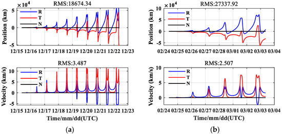 Two typical arcs of the transfer orbit of the all-electric GEO satellite are selected: the initial orbit is 00:00:00 on 15 December 2019 and 00:00:00 on 24 February 2020. First, the reference orbit is obtained by numerical integration, and then the electric thrust is added for integration. As shown in Figure 8, the influence of the electric thrust on orbit determination is as big as about 60,000 km, far exceeding other perturbations.