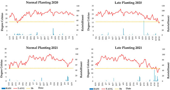 Air temperature during the growing season was similar for both growing conditions (NP and LP) and cropping years (2020, 2021), with daily averages being >15.9 °C (Tb) almost for the entire season (Figure 3). The harvest for all plots was completed on 15 September (127 DAP) for normal planting and 19 October (132 DAP) for late planting in 2020 and on 22 September (132 DAP) and 19 October (130 DAP) in 2021.