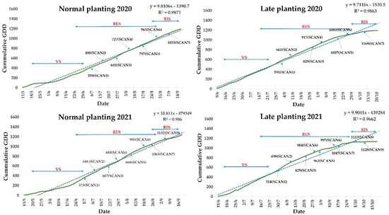 Pattern of GDD accumulation rates for both growing conditions and cropping years. Shown is the fitted linear regression line for the GDD parameters, along with the equations and R2. Scanning dates in dependence with GDD and sesame phenology phases (VS = vegetative stage, RES = reproductive stage, RIS = ripening stage).