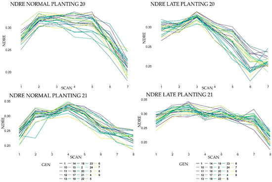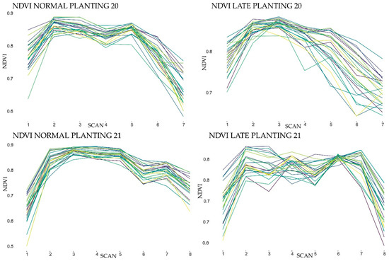 Moreover, the phenotyping in each crop/variety is significantly affected by the growth stage; thus, many researchers focus on investigating the optimal growth stage of scanning that could be used in the breeding trials. For wheat, a recent study showed that under dryland conditions, there is a reliable correlation between grain yield and NDVI at the early growing season, the anthesis growth stage and the mid-grain filling growth stage, as well as a poor association under irrigated conditions [48]. Relative differences in leaf senescence patterns of soybean cultivars have been studied to accurately calculate the observed maturity rate [49,50].