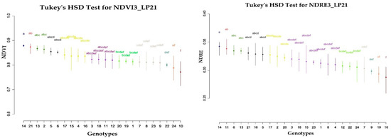 Tukey’s HSD separation procedure for NDVI and NDRE of the third monitoring date for the LP in 2021. Groups and range (genotypes with the same letter are not significant different).