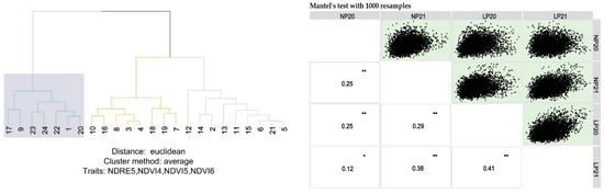 To check the relationships between the distance matrices when the clustering is performed separately for each growing condition and cropping year (NP20, LP20, NP21, LP21) a Mantel’s test was performed. The values of correlation between the distance matrices (0.12 to 0.41) suggest that clustering genotypes based on SRI indices, should not vary significantly among planting dates and years (Figure 7).