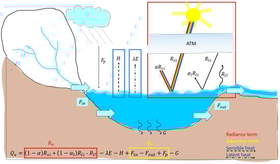 where is the net radiation at the surface of the water body, is the sensible energy, and is the latent energy computed as in Equation (1). We refer to the Supplementary Material S1 for the full description of the heat balance terms.