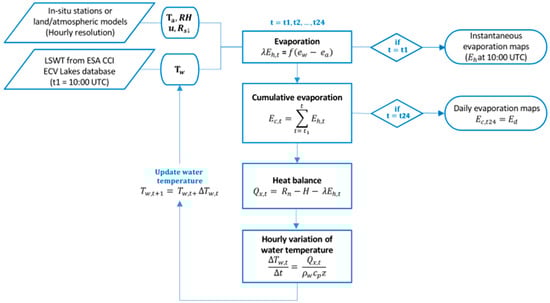 Based on the updated LSWT map and the meteorological data for the new time step, all the terms of the heat balance (including evaporation) are computed again in a loop for the subsequent 23 h.