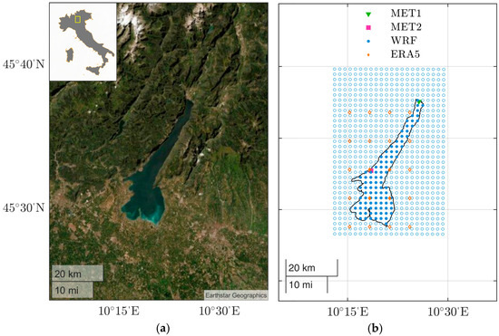 As for model data, we used ERA5-Land hourly data from ECMWF climate reanalysis [62] and Weather Research and Forecasting (WRF [63]) model outputs over the Lake Garda Region ([35,59]).