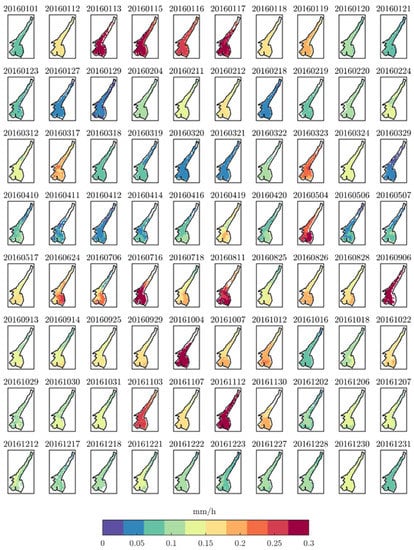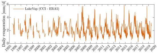 - Maps of daily evaporation () estimated during the 24 h including and after the satellite overpass (e.g., from 10:00 UTC to 09:00 UTC of the following day based on the CCI-Lakes dataset reference time). Daily evaporation is obtained by summing the hourly values estimated over the 24 h from the satellite overpass time.
