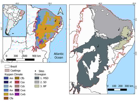 - Velloso, A.L.; Sampaio, E.V.S.B.; Giulietti, A.M.; Barbosa, M.R.V.; Castri, A.A.J.F.; Queiroz, L.P.; Fernandes, A.; Oren, D.C.; Cestaro, L.A.; Carvalho, A.J.E.; et al. Ecorregiões: Propostas para o Bioma Caatinga. In Associação Plantas do Nordeste; The Nature Conservancy do Brasil: Recife, Brazil, 2002; p. 75. [Google Scholar]
