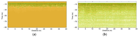 Once the DC offset was removed, the radargrams were represented prior to processing using the logarithms of the amplitudes in a way similar to that of article [56]. As the decay is exponential, this visualization gives greater significance to the smaller amplitudes corresponding to the last arrival times. Figure 1 shows an example of radargrams before and after DC correction on a logarithmic scale. The figure shows a significant difference in the case of the example presenting the corrected DC, and alternating positive and negative amplitudes are observed. Figure 1b shows a radargram with a severe so-called ringing, generally assigned to the contrast of physical properties between air and the topographic surface, or another shallow interface. Although one of the conventional processes aims to eliminate this ringing, this study focuses on the analysis of the decay of this signal that apparently contains a single frequency. Thus, although the application of a radon or f-k filter would eliminate the ringing seen in Figure 1b, producing different local amplitude changes in the radargram as a function of the wavenumber, it has not been applied to maintain the original wavelets of the propagation of the emitted signal.