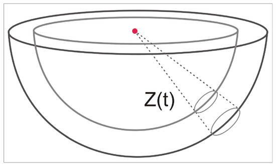 The geometric spreading of waves can be considered from two perspectives. First, the conservation of the energy flux of a wave, known as spherical divergence attenuation, results from the propagation of the wavefront through any medium and the loss of amplitude as it moves further away from the emitting source [17,20]. With the used antenna, where the two dipoles are parallel between them and to the surface, considering both energy and direction, only the main lobe is analyzed as having the greater effect on the wave propagation. This effect is purely geometric and independent of frequency, and is inversely proportional to the square of the distance to the transmitting antenna (Figure 2), which is based on flux conservation. In this sense, the expressions used for the attenuation of radar waves maintain parallelism with those used in reflection seismics because of the similarity between the appearances of both types of signals. Many authors have reported this similarity [57,58,59,60,61]; thus, these studies on the attenuation of seismic waves can be used to process GPR signals.