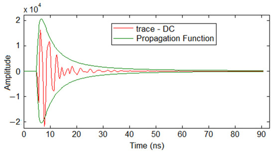 On analyzing the expression of the propagation function, the cosine in the numerator represents the dipole effect, which causes the function to exhibit an increasing trend at the beginning, such that it approaches the behavior of the traces. Furthermore, the losses due to the conservation effect of the flux through a progressively increasing surface are reflected in the denominator of this formula by the factor d2 (square of the traveled distance, v·t/2). The signal amplitude decreases by a factor equal to the square of the distance as the distance traveled increases. Thus, as shown in Figure 4, this function fits the trace being processed, implying that the generated propagation function reflects the GPR signal behavior.