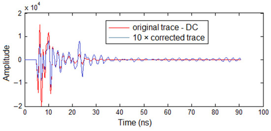 Example of an original trace (red) and the same trace corrected by the propagation function—geometric effects (blue). Corrected amplitudes have been multiplied by 10 for better visualization.