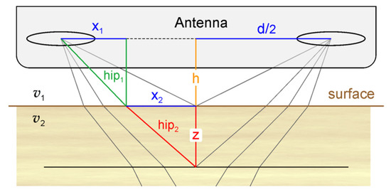 To correctly calculate the depths, we consider the part of the wave that travels through the air before entering the ground and just before it is received by the detector at a distance equivalent to the height of the antenna above the ground. Considering several geometrical considerations (Figure 6), we obtained the following expression relating both parameters: