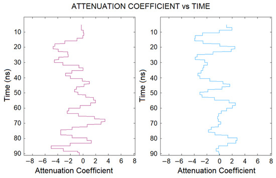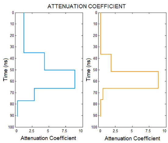 Thus, the variation in the attenuation coefficient with time or depth can be obtained for all traces of the radargram (Figure 11 shows the results of two example traces). Considering that this information is available for each trace constituting the radargram, all traces can be concatenated to obtain sections of the attenuation coefficient as a function of time or depth.