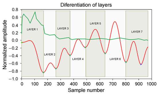 Once the stepped curves of all traces were obtained, they were filtered to eliminate the result of the discretization of the attenuation, and their critical points were determined by calculating the first and second derivatives. The subsequent step was to jointly analyze the location of these critical points in relation to the shape of the envelope curve. The top of each new layer is located at the point where the amplitude of the envelope starts to increase, whereas the bottom coincides with the minima, which subsequently grows because of the appearance of a new interface.