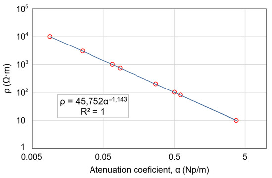 Substituting Equation (7) into Equation (2), the expression of the attenuation coefficient is simplified as a function of the frequency and electromagnetic parameters of the medium. Thus, by assigning values for the resistivity, the corresponding values of the attenuation coefficient are obtained. By fitting the pairs of values obtained (Figure 13) to a curve, a potential expression was obtained from the resistivity as a function of the attenuation coefficient (Equation (8)), which presents a regression coefficient equal to 1 as Equation (8) is a potential function.