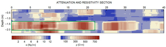 Among the three electromagnetic parameters shown in Equation (2) (the relative permittivity, electrical conductivity, and magnetic permeability), the latter can be considered to be invariable for all grounds usually studied using the GPR technique, which can be considered paramagnetic; it can therefore be attributed to the relative magnetic permeability of the unit value [47]. Therefore, in Equation (2), the attenuation coefficient is only a function of the resistivity and relative permittivity as the other elements of the equation are known for a given antenna frequency.