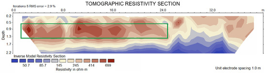 In the section shown in Figure 15, the main results regarding the resistivity distribution of subsoil represent a layer appearing at a depth of approximately 1.3 m up to 2.0 m (70 cm thickness) with higher values of resistivity than the upper and lower layers.