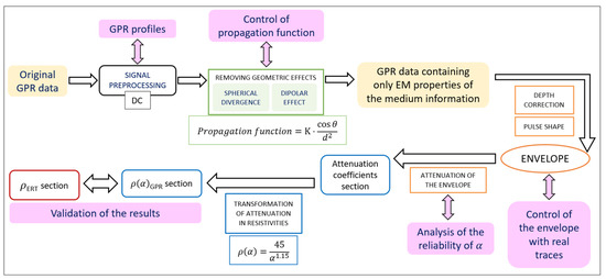 The methodology presented in this work consists of several steps grouped into two main stages. In the first, the aim is to correct the decay due to purely geometrical considerations and independent of the electromagnetic properties of the medium from the GPR signal. In the second stage, considering that the behavior of the signal resulting from the first stage is due solely to the electromagnetic properties of the medium, an envelope function for each trace is determined, from which the attenuation coefficients of the different layers traversed by the GPR signal are computed along each trace. These attenuation values are related to the resistivity values using the equation proposed in this study.
