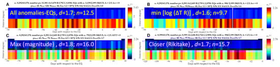Correlation of Swarm magnetic field anomalies with M5.5+ earthquakes using four different methods: (A) all anomalies are associated with all compatible earthquakes; (B) each anomaly is associated with the closest earthquake in space and time, i.e., the minimum of log(ΔT R); (C) the anomaly is associated with the greatest magnitude earthquake; (D) the anomaly is associated with the earthquake closer to the Rikitake law, with coefficients from De Santis et al. []. The graphs are cut for the vertical section without significant information, showing only the closer band to the earthquake epicenter. The color bar represents the density of anomalies in terms of the number of anomalies per square degree.