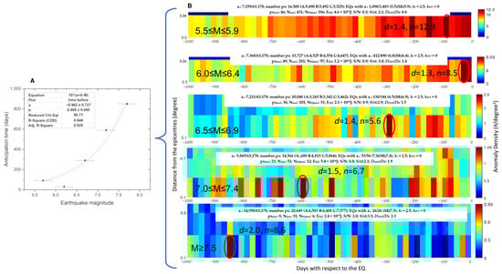 Correlation of Swarm magnetic field anomalies with earthquakes divided into five magnitude bands. (A) Fit of the anticipation time of maximum concentration (underlined by a red circle in subfigure (B) as a function of earthquake magnitude using the equation . The error bar takes into account the width of the pixel. (B) Details of the analysis in the earthquake magnitude bands of 5.5 ≤ M ≤ 5.9, 6.0 ≤ M ≤ 6.4, 6.5 ≤ M ≤ 6.9, 7.0 ≤ M ≤ 7.4, and M ≥ 7.5. Only the significant part of the superposed space-time graph is represented. The statistical indications of d (how many times the maximum real concentration is higher with respect to the random one) and n (how many standard deviations there are in which the real largest concentration is greater than the random one) are also shown. Such maximum concentrations (as objectively identified by the WSC algorithm) have been highlighted by a red or orange circle (the last one for a less significant concentration in terms of the Rikitake law). The color bar represents the density of the anomalies in terms of the number of anomalies per square degree.