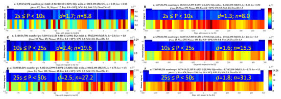 We finally noted that there seems to be a very long period underlined by dashed green boxes in Figure 3, with higher anomaly concentrations with respect to the rest (the identification of the green boxes is taken by sight considering the “more red or brown” bins, subjectively). We speculate that the density of the anomaly in the tails (i.e., before or after the green dashed box) is not due to the earthquake and that it is in the background due to other sources, while the increase in the anomalies could be related to a sort of seismic activation and to the consequences of the seismic event after their occurrence. Even these higher anomaly regions increase their duration (before the earthquake) with the period of the investigated signal. Future studies are fundamental to investigate this aspect better.