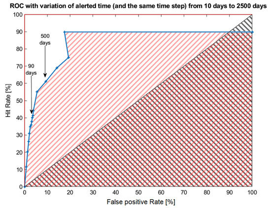 The ROC curve in bold blue in Figure 5 is obtained after testing several alerted times from 10 days (lower left side) to 2500 days (upper side). Two black arrows have underlined the two alerted times of 90 and 500 days, and they correspond to the one used in Table 2 and are mostly selected in this paper. In the same figures, the Area Under the Curve (AUC) has also been represented as a black inclined hatch for the random case (i.e., the one under the diagonal equal to 50% for the definition) and as a red inclined hatch for the real best Swarm anomalies, estimated to be equal to 83.6%. So, the AUC of the real data is 1.67 times better than that of a random predictor, confirming that WSC applied to Swarm data is able to extract potential pre-earthquake ionospheric disturbances.
