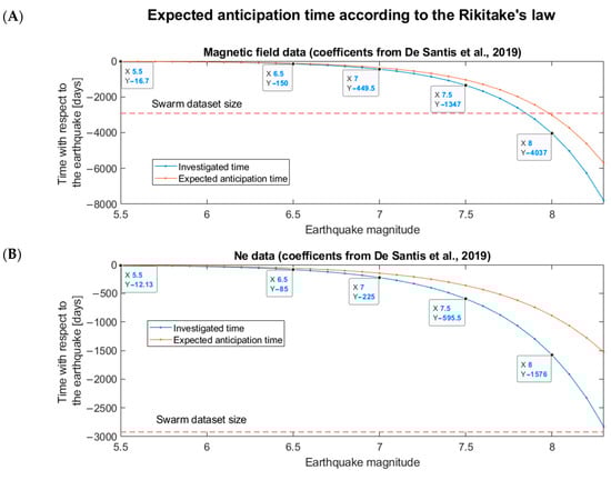 Expected anticipation time of magnetic field (A) and Ne (B) anomalies with respect to the earthquake, using the Rikitake law [] and considering the coefficients found by De Santis et al. [] for 4.7 years of Swarm data (orange line). The investigated time window is shown as a blue line, and the 8-year Swarm dataset maximum size is shown as a dashed red line. The data tips provide the time that has been analyzed before a specific magnitude earthquake, applying Equation (4).